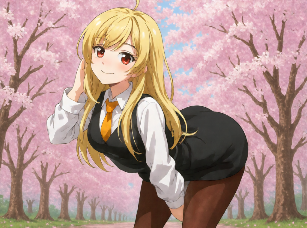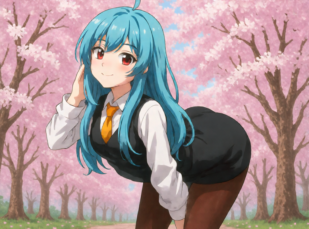 change background pink blossom with blossom trees and change girl’s hair color into ocean blue