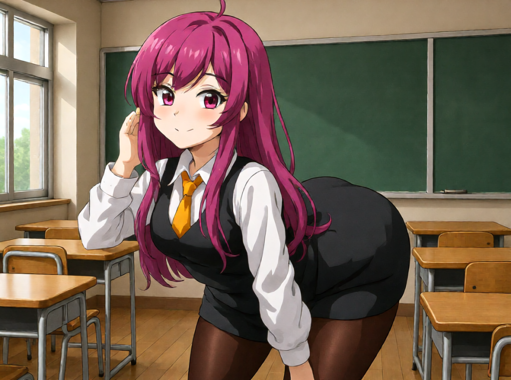 change background into japanese hightschool classroom and change girl’s hair color into magenta red
