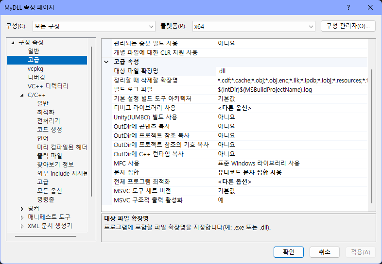고급에서 대상 파일 확장명이 .dll인지도 확인한다.