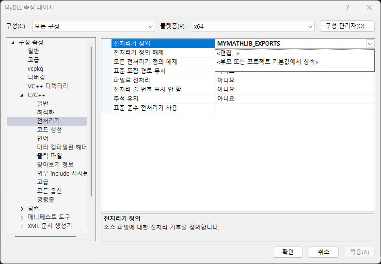 구성 속성 > C/C++ > 전처리기 > 전처리기정의에 MYMATHLIB_EXPORTS가 있는지 확인하고 없으면 편집을 눌러서 써넣는다.