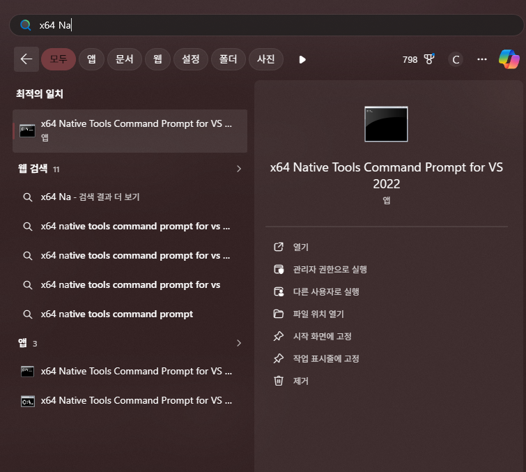 와 같이 x64 Native Tool Command Prompt 를 실행한다.